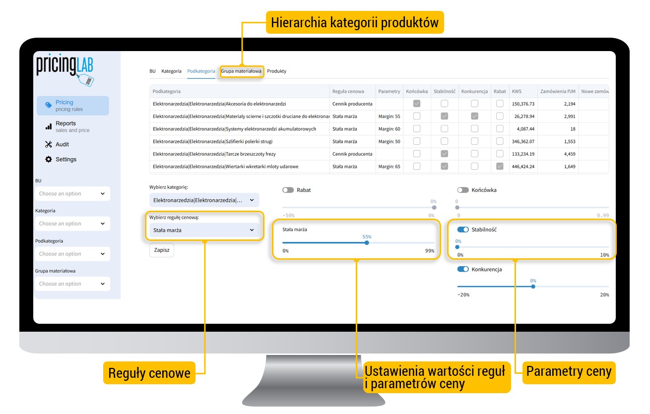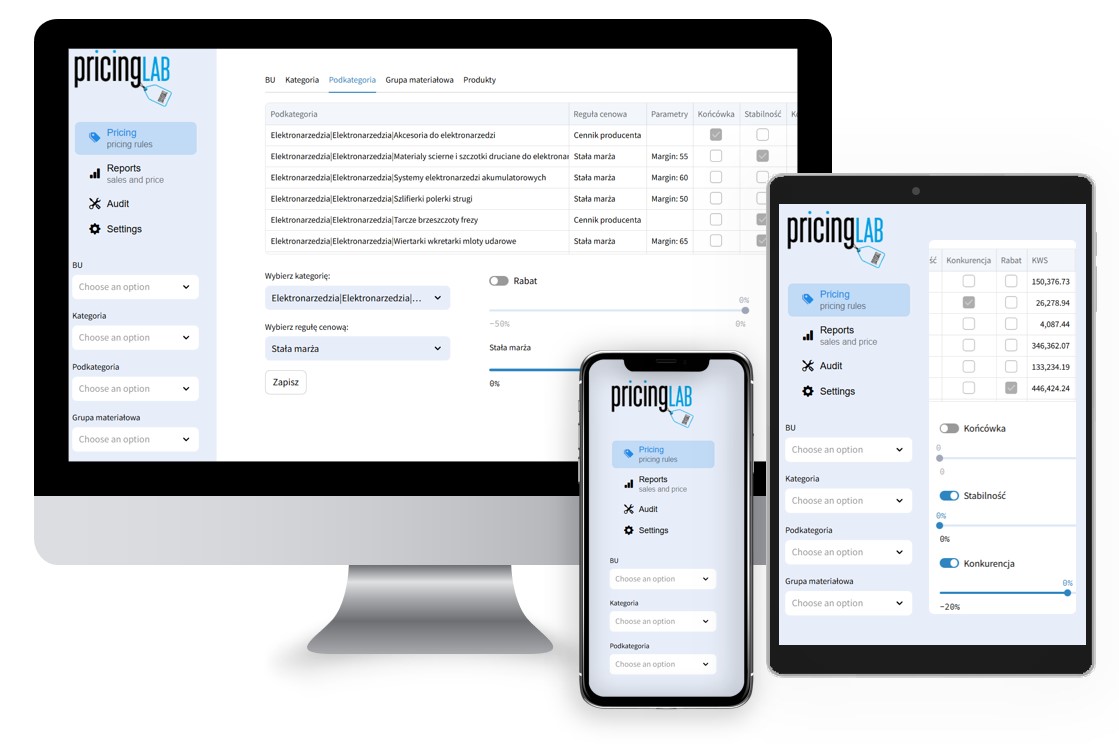 - Maksymalizacji masy marży poprzez zastosowanie skutecznej logiki cenowej dostosowywanej do zmian rynkowych